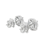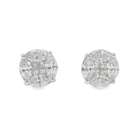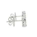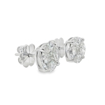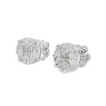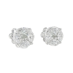 This pair of 18-Karat white gold cluster stud earrings features a central princess-cut diamond, surrounded by four marquis-cut diamonds in a round layout, all totaling 2.13 carats. The post-back earrings contain 3.77 grams of gold.