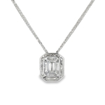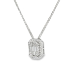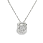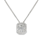 This 18-Karat white gold pendant features baguette diamonds and brilliant-cut diamonds arranged in an emmette cluster, surrounded by a diamond halo. The diamonds included in this classic design total 0.80 carats. The pendant has a hidden bail and a separate 16" gold chain.