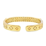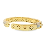 This 18-Karat yellow gold cuff bracelet features 17 brilliant diamonds totaling 1.82 carats in five elegant, bezel-set flowers, all laid out on Mother of Pearl inlay. The bracelet has a hinged opening and contains 33.10 grams of gold.
